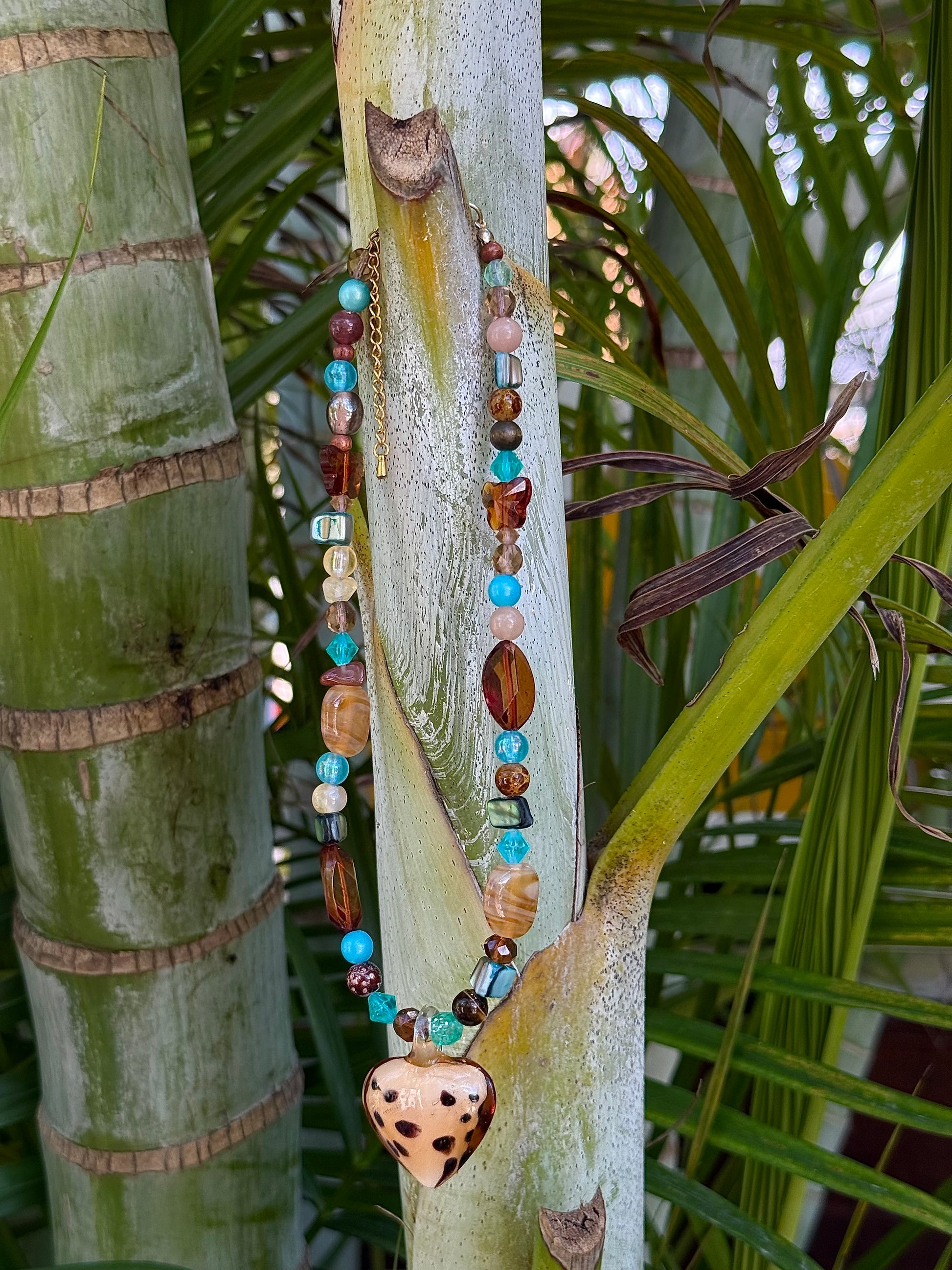Inspired by love in all its forms and the joy of vibrant colour, this necklace is a celebration of emotion. At its centre is a chunky glass heart pendant. Each necklace is strung with a playful mix of vintage beads and natural gemstones, creating a rainbow of texture like a treasure from a faraway world.