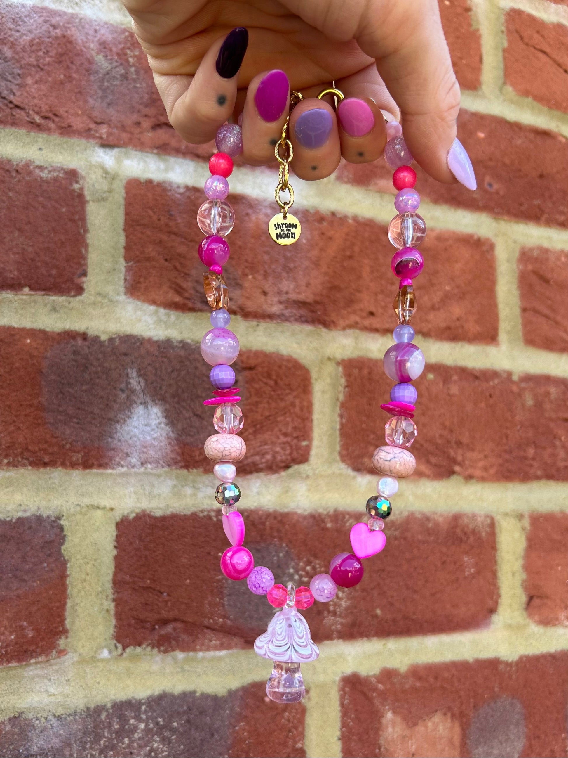 Handcrafted with up-cycled vintage beads and semi precious gemstones, each uniquely adorned in hues of nature, this necklace features a mystical glass mushroom pendant as a symbol of growth and transformation. The pendant shimmers with an ethereal glow, evoking the feeling of secret gardens and hidden realms.