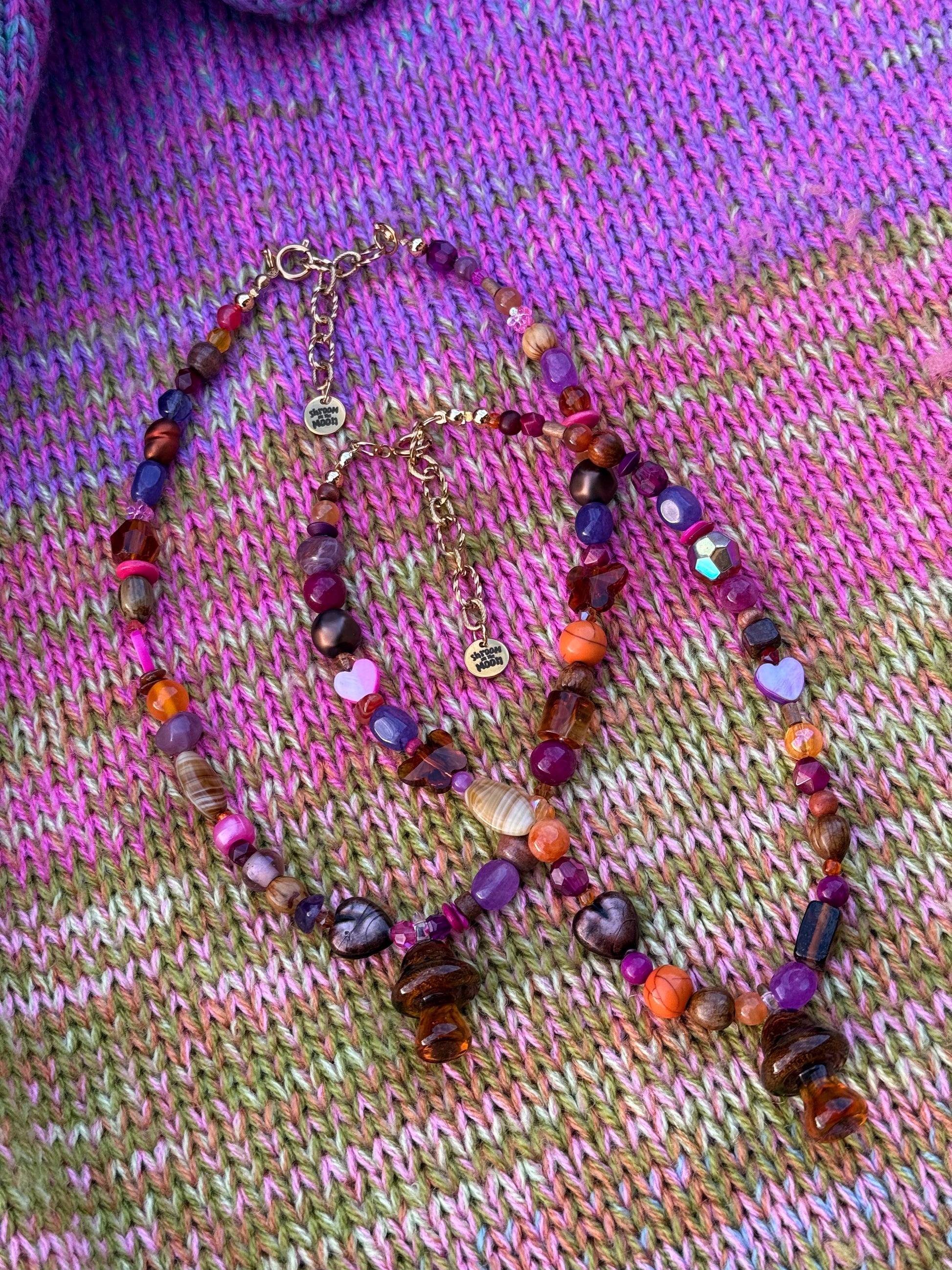 Lulu’s favourite colourway of our iconic Mother Mushroom necklace… so it had to become her signature style. A joyful combo of purples, oranges, and pinks, scattered with earthy tones that whisper of woodland wanderings.