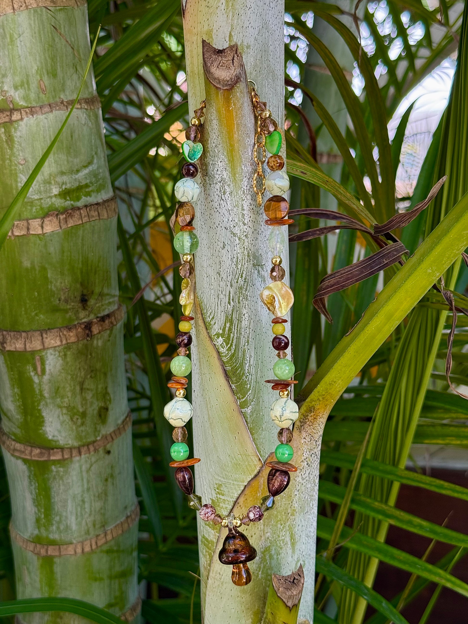Handcrafted with up-cycled vintage beads and semi precious gemstones, each uniquely adorned in hues of nature, this necklace features a mystical glass mushroom pendant as a symbol of growth and transformation. The pendant shimmers with an ethereal glow, evoking the feeling of secret gardens and hidden realms.